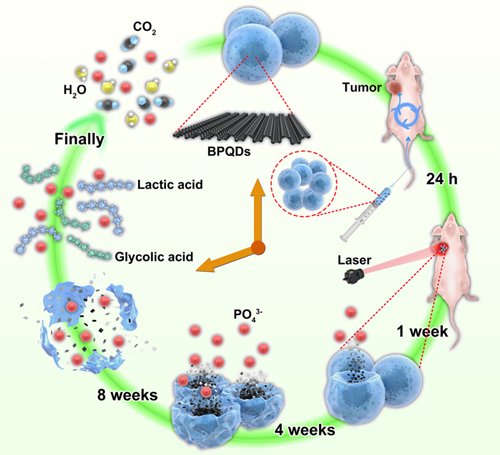中國科學院深圳先進技術研究院研究員喻學鋒與深圳大學教授張晗、香港城市大學教授朱劍豪等研究團隊采用了乳化溶劑揮發法,制備了一種高分子聚合物(PLGA)包裹黑磷量子點(BPQDs)的核殼結構納米球(BPQDs/PLGA)。PLGA作為一種可降解的疏水性生物醫用高分子,所形成的聚合物殼層能將內部的黑磷量子點與生理環境隔絕開,保證了黑磷量子點在治療過程中的性能穩定。光熱治療結束后,黑磷量子點又會隨著PLGA殼層的逐步降解得到緩慢釋放和降解,進而安全地代謝出體外。
