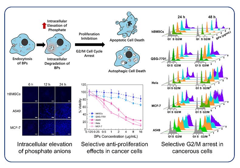 中國科學院深圳先進技術研究院研究員喻學鋒課題組在開發天然生物活性納米化療藥物領域取得新進展,提出了一種基于黑磷本征生物活性的癌癥活性磷療新技術。研究發現,由于癌細胞旺盛的胞吞作用、較快的代謝速率和較強的氧化壓力,黑磷納米片易被癌細胞通過胞吞作用大量攝取,并被快速降解,在胞內產生大量磷酸根離子。這一過程導致癌細胞內環境改變,引起G2/M期阻滯,從而有效抑制癌細胞增殖。增殖抑制后的癌細胞進一步通過凋亡和自噬的途徑進入程序化細胞死亡。而對于正常細胞,由于其較弱的攝取活性和代謝速率,黑磷的攝取少且降解緩慢,從而保持了很高的生物相容性。