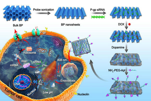 清華大學副教授梅林、深圳大學教授張晗以及哈佛大學教授施進軍、博士陶偉等專家組成的研究團隊采用優化的液態剝離法,首次將黑磷二維納米薄片應用于診斷治療制劑載體的制備以及功能化修飾,研發了一種負載化療藥物阿霉素的“黑磷納米片載體系統”。黑磷納米薄片被腫瘤細胞攝取后主要通過“巨胞飲→晚期內吞體→溶酶體”和“陷窩蛋白介導的攝取通路”進行細胞內活動,二維黑磷納米薄片較大的比表面積能夠為化療藥物分子的大量吸附奠定基礎,提高載藥能力。黑磷納米薄片對于阿霉素的負載量顯著高于傳統的聚合物納米粒子載體,提高了化療藥物療效。黑鱗納米薄片在808nm激光照射下能夠產生局部高熱,一方面可以用于腫瘤的光熱治療,另一方面也能夠驅動藥物的釋放。