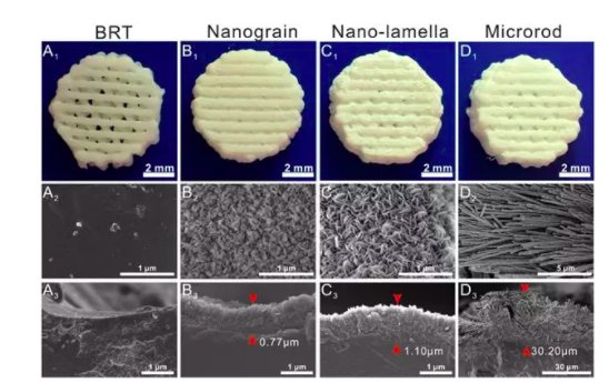 3D打印具有表面微結(jié)構(gòu)的生物陶瓷多孔支架。純BRT支架與不同表面微結(jié)構(gòu)修飾的復(fù)合支架Nanograin,Nano-lamella及Microrod的形貌。
