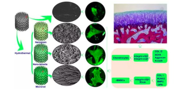隨后,活化的整合素誘導(dǎo)F-Actin重組,并進(jìn)一步促進(jìn)軟骨特異性基因(SOX9, Aggrecan,COL2及N-cadh)表達(dá),進(jìn)而促進(jìn)軟骨成熟。生物陶瓷表面微結(jié)構(gòu)除了對(duì)軟骨細(xì)胞有促進(jìn)作用,同時(shí)對(duì)骨髓間充質(zhì)干細(xì)胞(rBMSC)的成骨分化也有誘導(dǎo)作用。