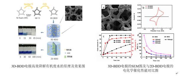 該團隊在國際上首次采用化學氣相沉積(CVD)技術在泡沫鎳上構建具有三維網絡大孔結構的BDD泡沫電極,相較于同尺寸封閉型二維平板電極,BDD泡沫電極不僅電化學有效活性面積提升了20倍,而且分布均勻、尺寸可調的三維網絡孔洞結構可供廢水自由流通,極大地加速了液相與電極表面的對流,提升了液相的傳質速率。“大比表面積+高傳質速率”的協同效應,極大地提高電極的降解效率,在2.4mA/cm2的小電流密度下,BDD泡沫電極電化學降解活性藍19僅1h移出率就超過95%、礦化率超過80%。BDD泡沫電極電化學性能優異,制備方法簡單可重復,空間利用率高,將若干個BDD泡沫電極組裝在一起,可形成一個質量輕、占地面積小、效率高、能耗低的實際廢水處理裝置,在難降解有機廢水領域具有十分廣闊的應用前景。此外,BDD泡沫電極成功制備也將有利于推進金剛石在電催化、電合成、電化學傳感、超級電容等領域的應用。