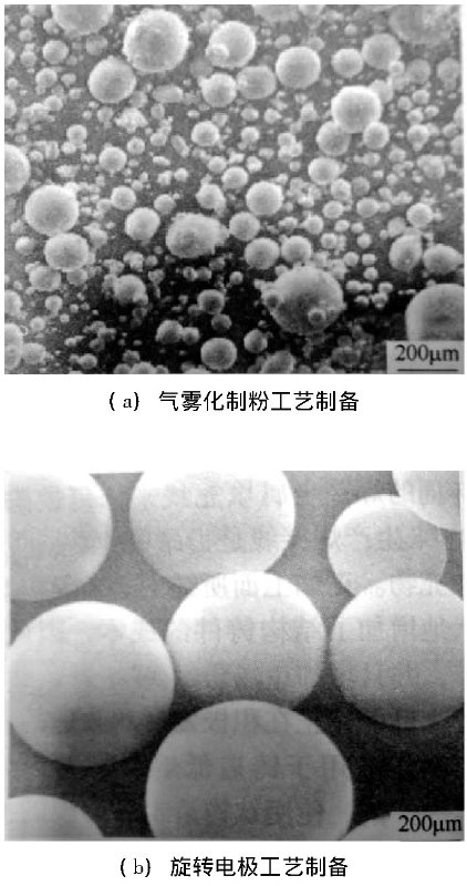 圖5 氣霧化制粉工藝和旋轉電極工藝制備的球形鈦粉 Fig.5 The spherical titanium powder prepared by gas atomization process and rotating electrode process