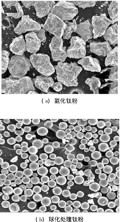 目前加拿大的泰克納 (TEKNA) 公司開發的射頻等離子體粉體處理系統, 在世界范圍內處于領先地位, 可以實現Ti、Ti-6Al-4V、W、Mo、Ta、Ni等金屬及其合金粉末的生產。國內北京科技大學在射頻等離子球化方面進行了大量的研究, 可以試驗W、Mo、Ti等金屬粉末的球化處理, 同時, 北京科技大學以氫化鈦粉為原料, 將射頻等離子球化處理與“氫爆”相結合, 球化過程中實現脫氫, 制備超細球形鈦粉, 粒度范圍可以達到20~50μm, 圖6是氫化鈦粉末經射頻等離子球化前后粉末形貌圖。