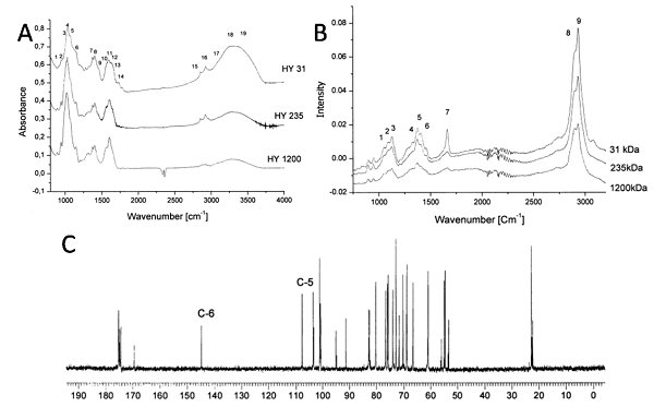 圖7 透明質酸的(A) IR圖、(B)Raman圖和(C)13C NMR譜圖[7]。