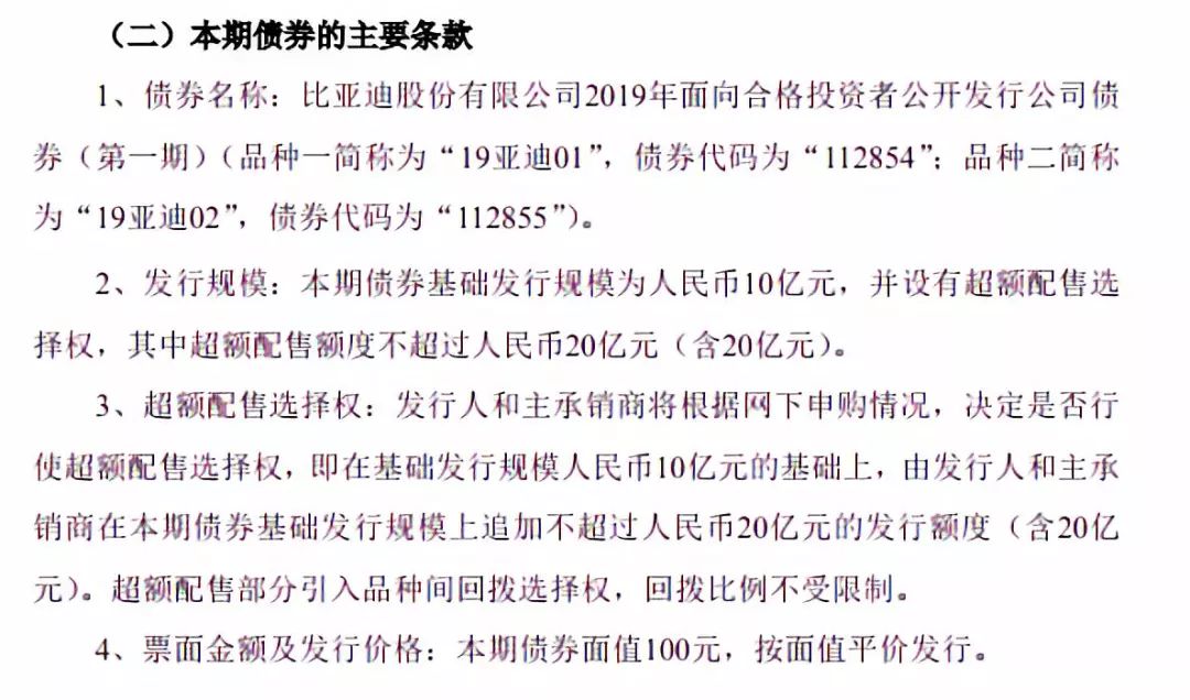 2月20日,比亞迪(002594)發布募集2019年面向合格投資者公開發行公司債券(第一期)的相關公告。公告顯示,第一期無擔保債券總規模為30億元,包括基礎發行規模為10億元,并設超額配售不超過20億元,年期為5年,并分兩個品種,其票面利率預設區域分別是3.5%至5%,以及4%至5.5%。
