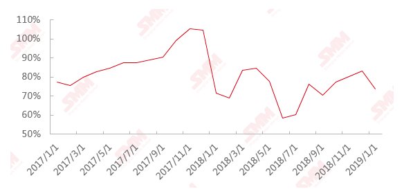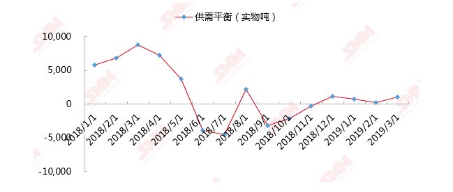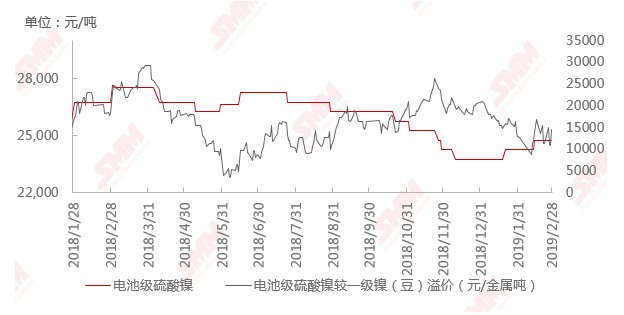 據SMM硫酸鎳供需平衡模型,當前硫酸鎳市場處于緊平衡。供應增量有限,原因在于:1. 盡管行業產能利用率尚未達到100%,但是未開足產能主要是受到了環保及資金壓力的影響難以放量,在沒有新增產能的前提下產量的提升已到了瓶頸。2. 硫酸鎳的主要生產原料——濕法中間品相對緊缺,而當前電池級硫酸鎳較一級鎳(豆)溢價約11700元/噸(據SMM2019年3月1日價格推算),SMM了解,在此溢價下目前僅生產成本占優的一體化前驅體工廠使用鎳豆/鎳粉來生產硫酸鎳,但尚不足以刺激非一體化的工廠使用鎳豆/鎳粉來生產硫酸鎳。