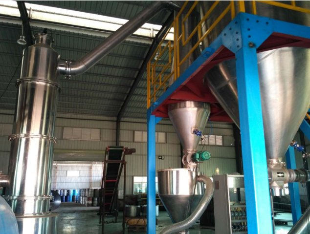 干粉隨氣流進入旋風收集器,成品由收集器底部出料排出,尾氣中夾帶的細粉通過脈沖布袋除塵器進一步過濾分離,凈化后的尾氣由引風機排除。旋轉式閃蒸干燥機具有適應物料范圍廣,能處理膏狀濾餅,生產能力大,連續密閉操作以及干燥物料一次成粉等優點。由于設計了獨特的破碎機構和進料裝置,使得物料在干燥器內能以最短時間分散,強化了傳熱效果,使熱效率達65%。