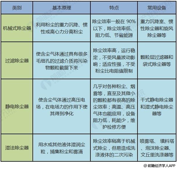 根據工作原理分類,除塵器可分為靜電式除塵器、袋式除塵器、濕式除塵器及旋風除塵器等。其中,靜電式除塵器除塵效率高、運行費用較低,但設備龐大、占地面積大,設備制造、安裝、維護要求高、對粉塵的特性較為敏感;袋式除塵器除塵效率也高,使用靈活,結構簡單,投資小,但維護成本較高;濕式除塵器效率比干式高,處理高溫高濕及黏性大的粉塵,結構簡單,一次投資小,但不適用于憎水性和水硬性粉塵,防冬季結冰;旋風除塵器結構簡單,維護方便。