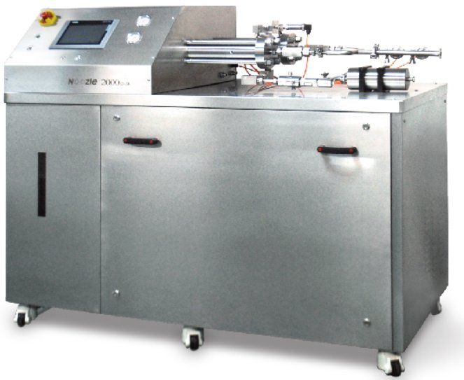 物料流經單向閥后,在高壓腔泵里加壓。通過微米級的噴嘴,以亞音速撞擊在乳化腔上,同時通過強烈的空穴,剪切效應,得到足夠小而均一的粒徑分布。
