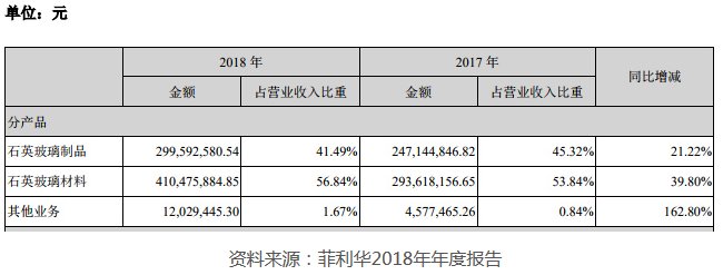 菲利華年度報告顯示,公司主要從事新材料產品及裝備的技術開發、技術轉讓、技術咨詢、技術服務;石英材料、玻璃材料、特種纖維材料、復合材料及制品的制造與銷售。其產品廣泛用于半導體、光通訊、光學、航空航天等領域。2018年,公司石英玻璃制品、石英玻璃材料、其他業務收入分別29,959.26萬元、41,047.59萬元、1,202.94萬元,占營業收入比重為41.49%、56.84%、1.67%。詳情如下: