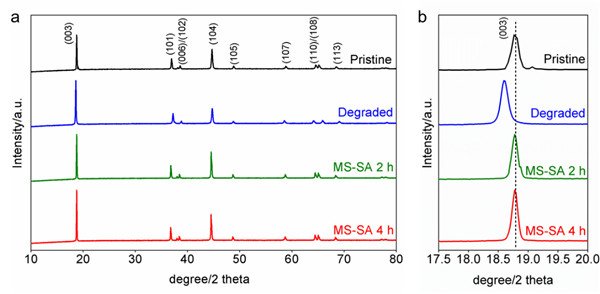 ICP對化學組分的測量結果顯示,衰減后的NCM523有高達40%的鋰流失,鋰的含量只有原始含量的60%,另外,在X射線衍射圖中(圖3),衰減后的材料(003)峰明顯左移,對應于層間距的增大,與鋰的流失有直接關系。而經過再生后的材料,ICP結果顯示鋰含量恢復至原始值,而且(003)峰移回至原始位置,證明了該再生過程成功將鋰補充進衰減的正極材料。