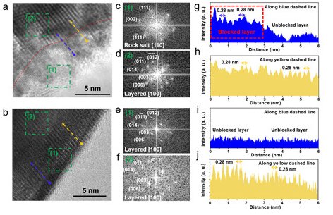 圖4 衰減后 (a, c, d,g, h) 和再生后 (b, e, f, i, j) 的NCM523正極材料的高分辨TEM/FFT圖像及強度曲線