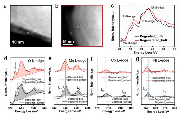 在衰減的材料表面高分辨TEM圖像中觀察到了鹽巖相結構(圖4),沿鋰層的強度曲線顯示表面的強度顯著增加,該現象由過渡金屬元素遷移到鋰所在層導致,證明了材料表面發生了相變。而在再生的材料表面并未觀察到鹽巖相和過渡金屬元素在鋰層的存在。EELS可獲得衰減/再生材料的表面和內部的過渡金屬氧化態(圖5),進一步支持了從TEM圖像中得到的結論:再生過程可以將鹽巖相恢復至材料原始的層狀結構,實現了表面晶體結構的恢復。