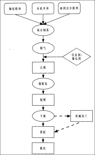 注凝成型是在懸浮介質中加入乙烯基有機單體,然后利用催化劑和引發劑通過自由基反應使有機單體進行交聯,坯體實現原位固化。凝膠注模成型技術是美國橡樹嶺國家實驗室的研究者在20世紀90年代初首先發明的一種新的膠態快速成型工藝。
