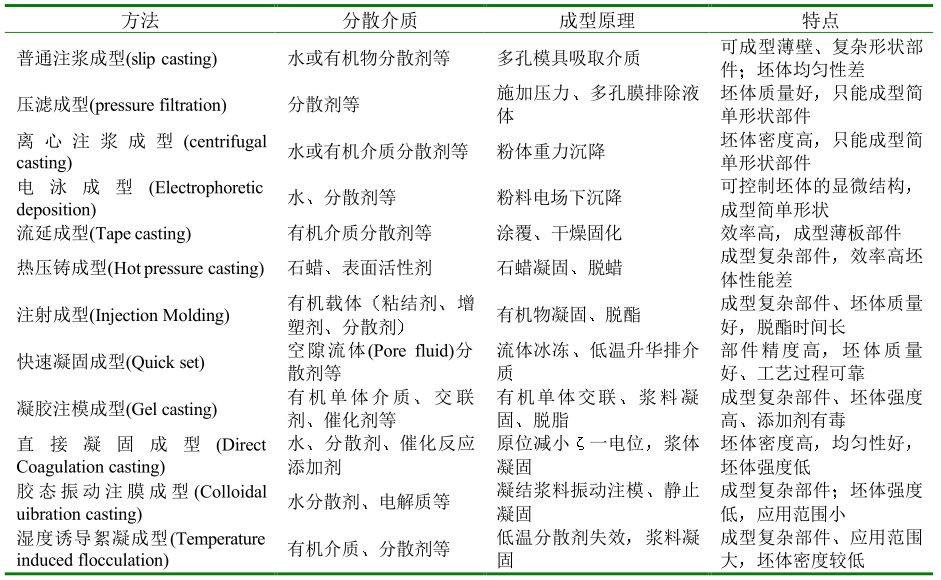優點:不需或只需少量的有機添加劑(小于1wt%),坯體不需脫脂,坯體密度均勻,相對密度較高,而且可成型大尺寸復雜形狀的陶瓷部件。