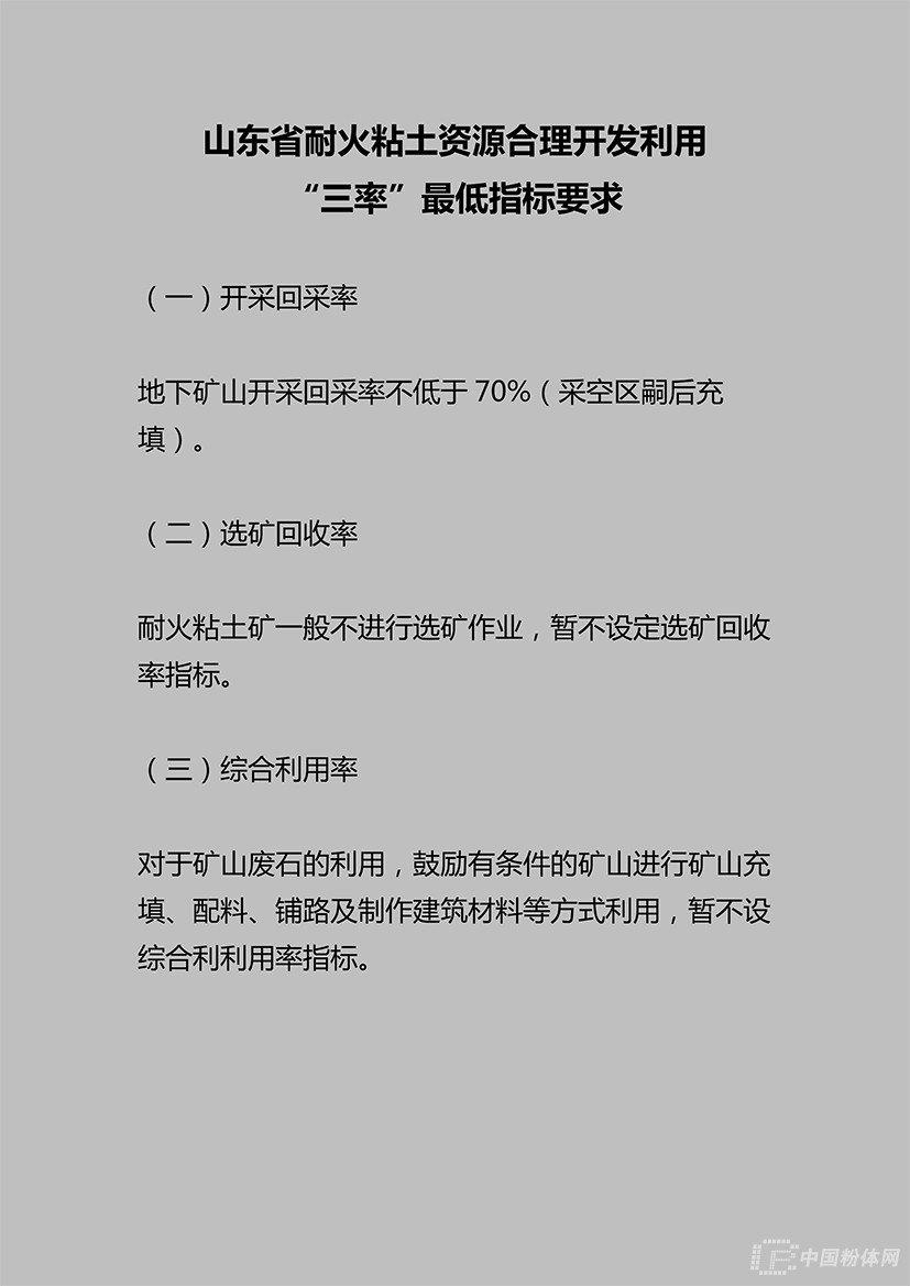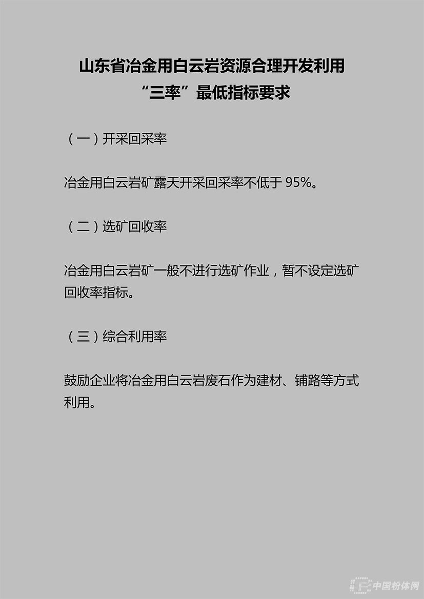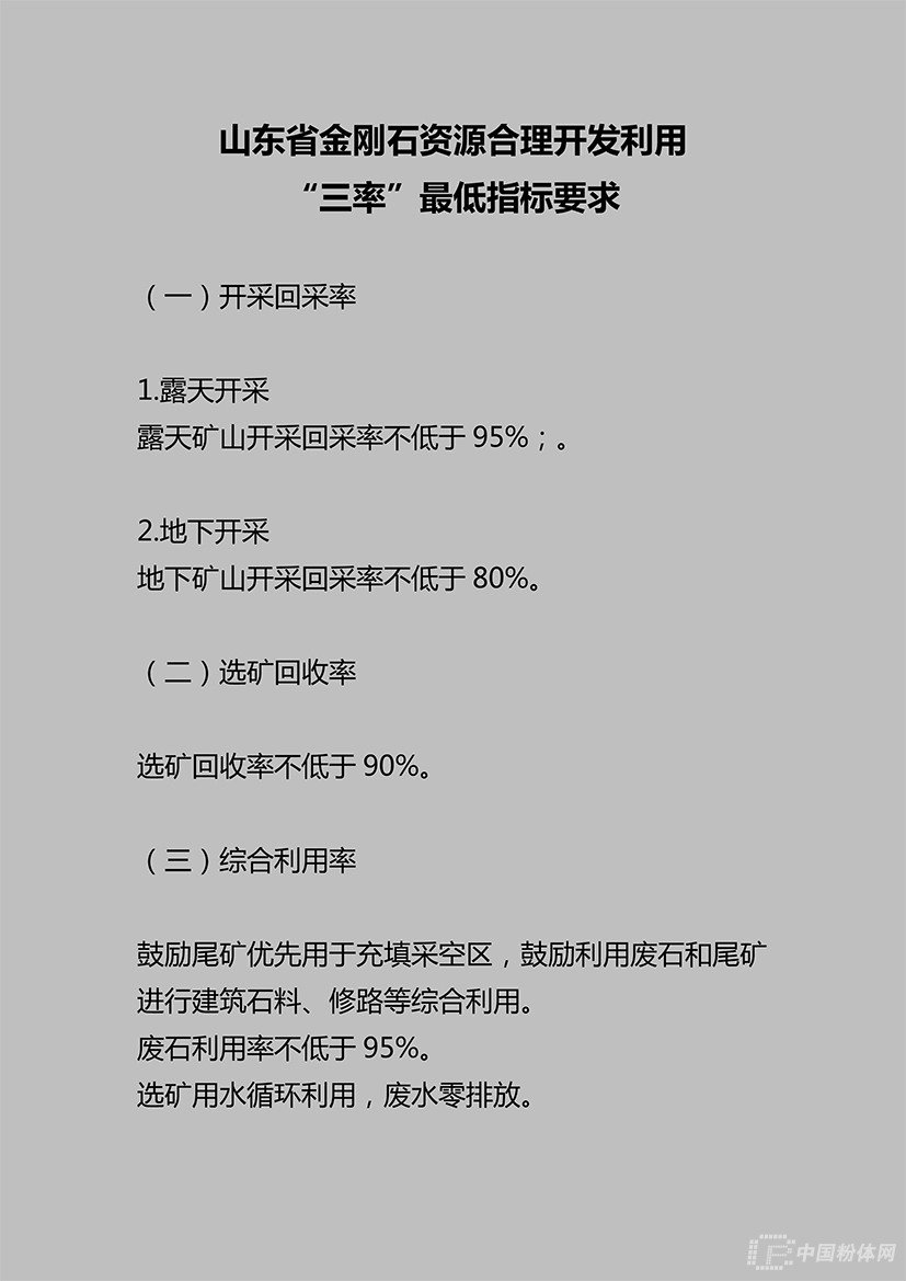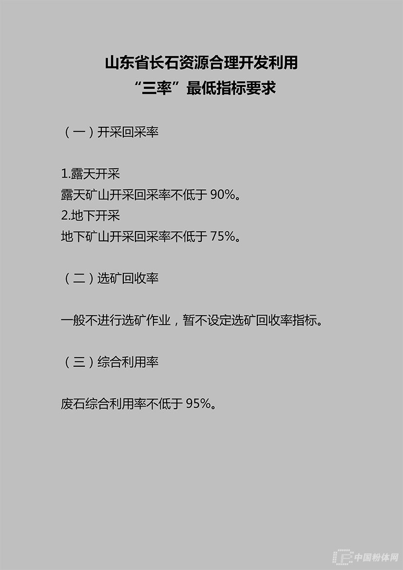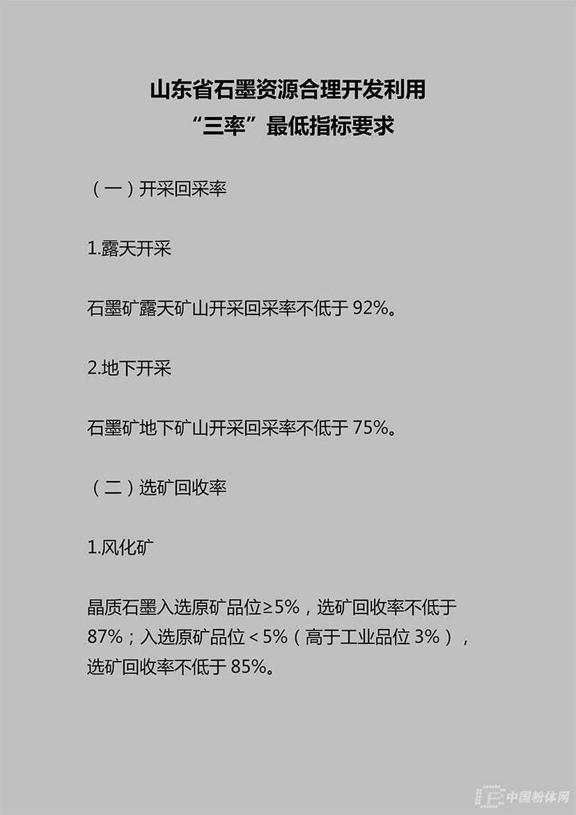 2019年4月16日,山東省自然資源廳發布公告,提出山東省石墨、水泥用灰巖、耐火黏土、金剛石、巖鹽、冶金用白云巖、長石等7種礦產資源合理開發利用“三率”最低指標要求。