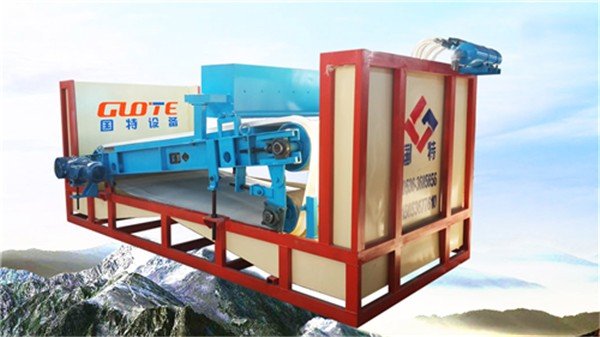 該產品礦漿在重力作用下沿磁板的傾斜方向向下流動,礦漿中的鐵磁物在磁板強大的磁場力作用下被牢牢吸附在卸鐵皮帶上,卸鐵皮帶在電機帶動下沿磁板傾斜的上方轉動,同時將吸附的鐵磁性物帶入卸鐵區。