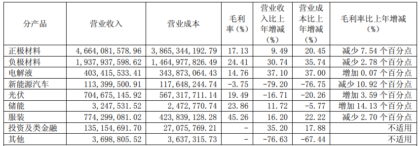 杉杉股份表示,報告期內,鋰電池材料業務實現主營業務收入70.05億元,同比增長16.06%;實現歸屬于上市公司股東的凈利潤4.41億元,同比下降21.67%。其中: