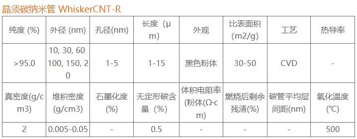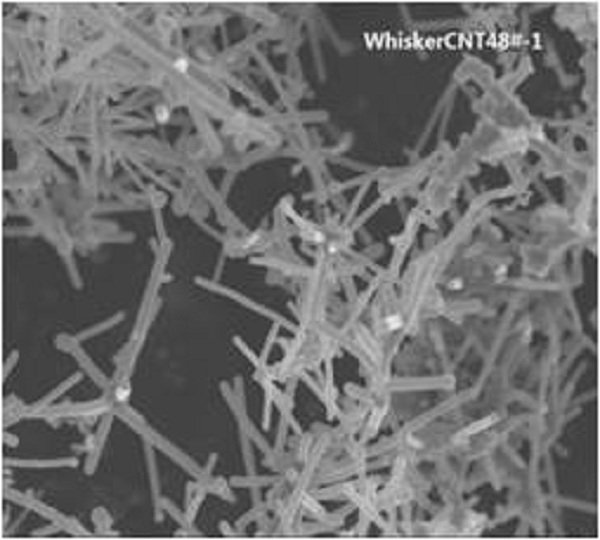 碳納米管是具有優(yōu)異的機(jī)械、物理和化學(xué)性能,但傳統(tǒng)碳納米管團(tuán)聚嚴(yán)重,缺陷多,不易分散。晶須碳納米管具有直線型碳納米管,具有極高純度和結(jié)晶度,易分散,可廣泛用于鋰離子電池、電熱轉(zhuǎn)換器件和納米復(fù)合材料領(lǐng)域。其高強(qiáng)度、高導(dǎo)電、高導(dǎo)熱,是納米復(fù)合材料的重要增強(qiáng)相,可大幅提升鋰離子電池的倍率性和循環(huán)性能以及復(fù)合材料的各性能。晶須碳納米管還具有極高的電解液吸附能力,是動(dòng)力鋰離子電池正負(fù)極材料的重要添加劑。
