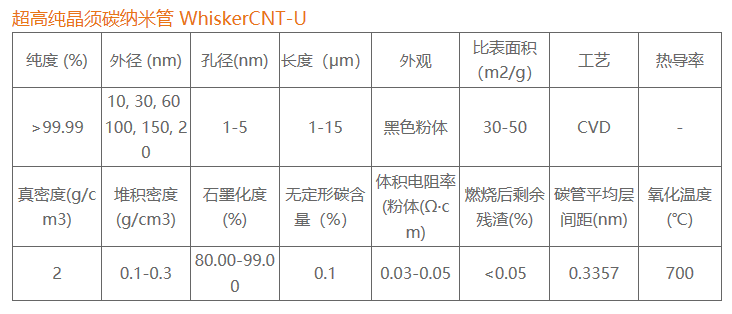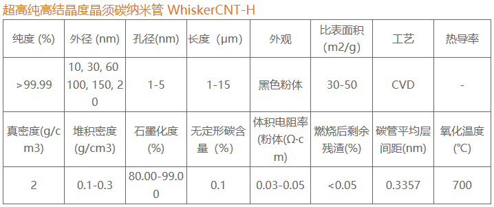 晶須碳納米管具有直線型結(jié)構(gòu)、不纏繞、易分散、超高純度、超高結(jié)晶度、導(dǎo)電、導(dǎo)熱性能優(yōu)異,WhiskerCNT是新一代高端碳納米管,在鋰離子電池、電熱轉(zhuǎn)換器件和納米復(fù)合材料等眾多領(lǐng)域具有廣泛的用途。公司目前主要產(chǎn)品包括各種規(guī)格的晶須碳納米管粉體、晶須碳納米管導(dǎo)電漿料等碳基納米材料。