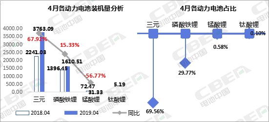 從動力電池種類來看,2019年4月配套的動力電池主要以三元電池為主,裝機量占新能源汽車市場份額的70%,裝機量約3.76GWh,與去年同期相比增加了十個百分點;值得關注的是,4月配套的錳酸鋰電池裝機量,同比下降了56.77%,下降原因主要配套在專用車領域的錳酸鋰電池在減少。