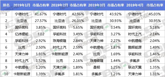從動力電池企業排名來看,2019年4月裝機量排名前10的企業如下圖所示,寧德時代以2.44GWh奪得第一,占比45.03%,與上月相比增長一個百分點,霸主地位穩固;比亞迪裝機量為1.67GWh位列第二,占比30.95%;合肥國軒緊隨其后,裝機量約0.28GWh,占比5.18%。從市場占有率來看,前十電池企業裝機量占4月總裝機量的92.4%,而前三家電池企業裝機量之和就占據4月總裝機量的81.16%,動力電池行業集中度較高,同時不難看出寧德時代、比亞迪和國軒高科這三家電池企業,在2019年前4月一直穩居前三。
