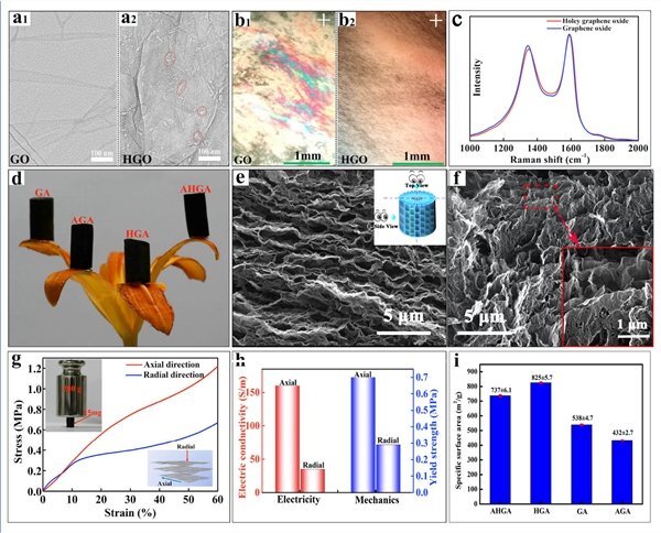 圖 1 各向異性“孔洞石墨烯”氣凝膠基本表征:氧化石墨烯片層的透射電鏡照片(a1)及氧化石墨烯液晶的偏光顯微鏡照片(b1),孔洞氧化石墨烯片層的透射電鏡照片(a2)及氧化石墨烯液晶的偏光顯微鏡照片(b2),氧化石墨烯及孔洞氧化石墨烯片層的拉曼光譜(c),各向異性“孔洞石墨烯”氣凝膠的光學照片(d)、掃描電鏡照片(e,f)、力學(g)、電學(h)及比表面積數據(i)。