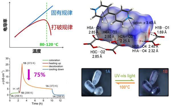 在國(guó)家自然科學(xué)基金、中國(guó)科學(xué)院前沿科學(xué)重點(diǎn)研究項(xiàng)目、中科院青年創(chuàng)新促進(jìn)會(huì)優(yōu)秀會(huì)員項(xiàng)目等支持下,基于前期在紫精/金屬紫精基光致變色化合物和智能變色半導(dǎo)體方面的系列科學(xué)發(fā)現(xiàn),中科院福建物質(zhì)結(jié)構(gòu)研究所結(jié)構(gòu)化學(xué)國(guó)家重點(diǎn)實(shí)驗(yàn)室郭國(guó)聰課題組的王明盛研究小組新近把光致變色性質(zhì)的特點(diǎn)應(yīng)用于半導(dǎo)體高溫電學(xué)性質(zhì)的調(diào)制,打破了傳統(tǒng)思維。為實(shí)現(xiàn)這個(gè)目標(biāo),郭國(guó)聰和王明盛領(lǐng)銜的研究團(tuán)隊(duì)先前提出通過(guò)熱顯色降低載流子濃度從而降低電導(dǎo)率的學(xué)術(shù)思路,但可惜,由于電導(dǎo)率隨溫度的增加而增加的固有規(guī)律占據(jù)優(yōu)勢(shì),所研究的變色半導(dǎo)體在高溫下的變色和顯色態(tài)電導(dǎo)率相差很小(Sun C,Wang MS,* Guo GC* et al. Angew Chem Int Ed 2017, 56, 554)。為解決這個(gè)問(wèn)題,王明盛帶領(lǐng)的研究小組最近提出通過(guò)T-型光致變色半導(dǎo)體的逆向熱褪色過(guò)程來(lái)“節(jié)流”的學(xué)術(shù)思路:尋找一種能夠發(fā)生光致電子轉(zhuǎn)移的變色半導(dǎo)體,其電子轉(zhuǎn)移后載流子(電子和空穴)遷移率更高,但在高溫下能夠快速發(fā)生逆向電子轉(zhuǎn)移,在褪色的同時(shí),使載流子(電子和空穴)遷移率變低。文獻(xiàn)報(bào)道,紫精基光致變色材料通常能夠發(fā)生熱褪色,且紫精離子可以通過(guò)陽(yáng)離子-π相互作用構(gòu)筑有機(jī)半導(dǎo)體。在先前工作中,郭國(guó)聰和王明盛等合作發(fā)現(xiàn),如果電子轉(zhuǎn)移到紫精離子π聚集體中,可以提高π聚集體間電子/空穴耦合相互作用,并使得價(jià)態(tài)頂端的電子態(tài)密度增加,使得導(dǎo)電能力大大增強(qiáng)(Sun C,Wang MS,* Guo GC* et al. J. Am. Chem. Soc. 2018, 140, 2805–2811)。因此,紫精基T-型致變色半導(dǎo)體是實(shí)現(xiàn)上述學(xué)術(shù)思想的很好例子。
