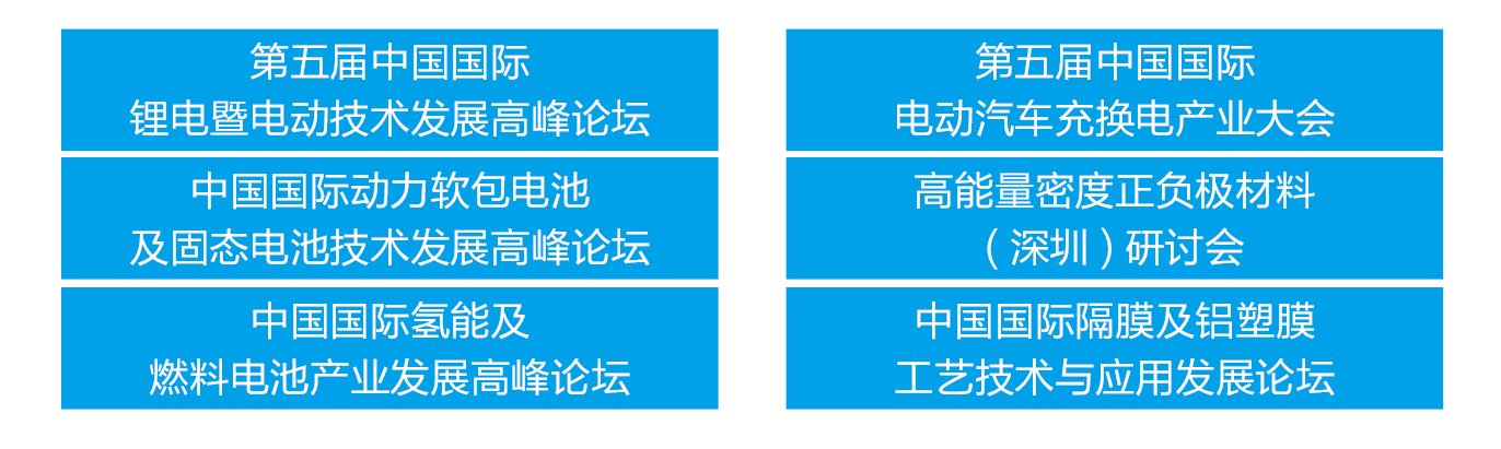 展會同期舉辦:2019 第五屆中國國際鋰電暨電動技術發展高峰論壇、中國國際動力軟包電池及固態電池技術發展高峰論壇、高能量密度正負極材料(深圳)研討會、深圳電動出行展、深圳氫能暨燃料電池展、深圳充電樁技術設備展、2019 中國鋰電池行業年度品牌評選活動。