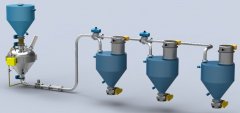 壓送式系統,采用空壓機組作為動力源,物料自某一設備出料,通過雙蝶閥,在重力作用下被加入其下方的發送罐內,置換的空氣通過排氣閥釋放出去,從而使進料更加容易,同時也消除了阻礙物料流動的反向壓力。當發送罐被裝滿時(通過料位計或稱重設備顯示,達到罐容積的90%),進料閥門和排氣閥門同時被關閉并密封,而后通過進氣閥向發送罐頂部加入壓縮空氣,加入的壓縮空氣與物料相混合,當罐內的壓力達到一定值時便自動開始推動物料移動,同時向整個輸送管道施壓,直至物料排空;中途輸送過程中伴有增壓器的補壓作用,使得輸送均勻流暢。當發送罐內壓力降為零時,氣力供給被關閉,同時少量剩余的氣體也被排出發送罐和輸送管線。物料到達終端可以直接進入預先所選擇的料倉,輸送末端產生的氣體與粉塵通過安裝于料倉上方的倉頂除塵器進行粉塵去除。