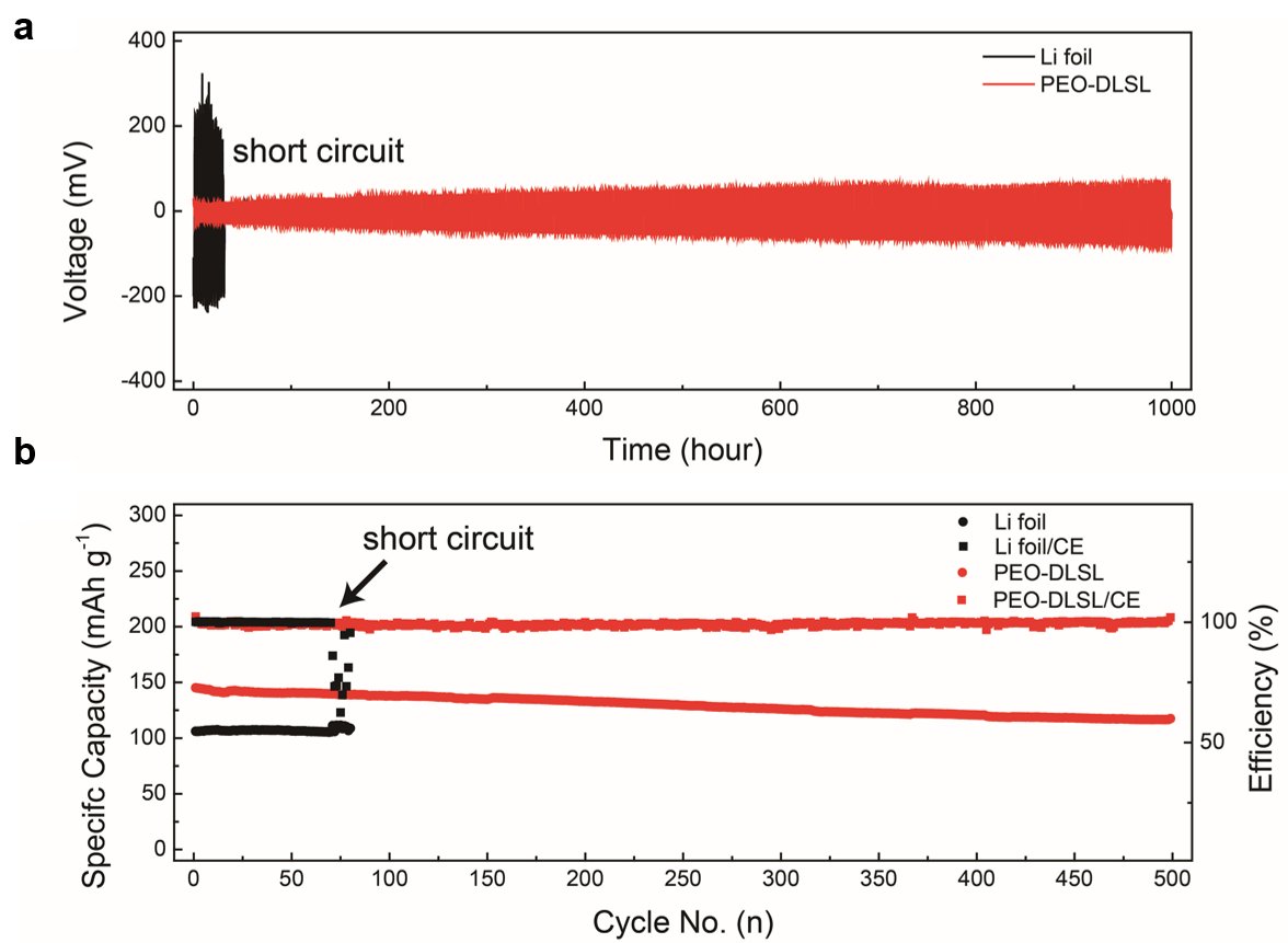 以PEO-SPE作為固態電解質,PEO-DLSL對稱電池在鋰脫出/沉積測試中可穩定性循環超過1000小時不短路,同時極化電壓可以保持在100毫伏以下。而傳統的鋰箔負極表現出很高的極化電壓(200毫伏以上)并且在循環50圈后就發生了短路(圖2a)。研究人員進一步考察了PEO-DLSL在全固態鋰金屬電池(PEO-SPE為固態電解質,磷酸鐵鋰為正極)中的性能,如圖2b所示,基于PEO-DLSL的固態鋰金屬電池表現出非常好的循環穩定性(0.5C倍率下可循環500圈,容量衰減速率為0.04%/每圈),而采用平板鋰箔的固態鋰金屬電池在循環75圈后即發生了短路(圖2a)。