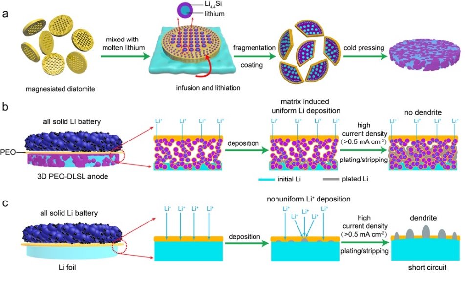 研究人員首先通過鎂熱還原法將天然的硅藻土轉化為具有多級孔道結構的硅框架。隨后,將該多級結構硅框架與熔融態的鋰金屬混合并充分攪拌反應制得鋰-硅復合粉體。然后,采用聚環氧乙烷基聚合物固態電解質(PEO-SPE)對鋰-硅粉體進行表面修飾。最后,通過冷壓工藝將上述粉體在模具中壓制成具有多級結構的復合鋰金屬負極(PEO-DLSL)(圖1a)。在PEO-DLSL中,鋰金屬是嵌在PEO-SPE修飾的Li4.4Si框架的孔道結構之中,從而提升了其與電解質的接觸面積,有利于得到更均勻的鋰離子流,保持了電極結構的完整性。從而使得在較高電流密度下(>0.5 mA cm-2),多級結構鋰金屬復合負極能夠實現鋰金屬的均勻沉積和脫出,有效抑制了鋰枝晶的生長(圖1b)。而對于傳統的平板鋰箔而言,在同樣的條件下,鋰枝晶很容易生長并引起電池短路(圖1c)。