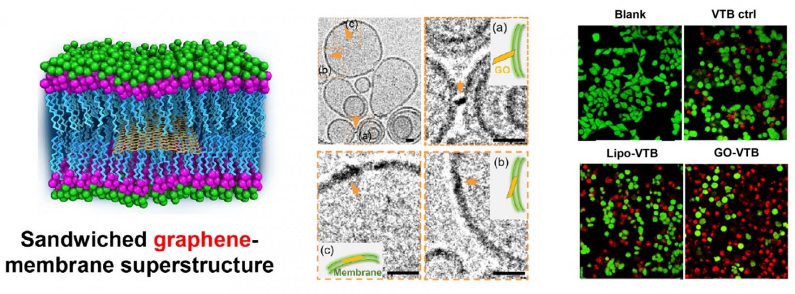 石墨烯-生物膜超級結構雖然已有預測,但一直沒有被證實。此次,過程工程所研發團隊不僅利用冷凍透射等觀察到二維材料氧化石墨烯-生物膜三明治及其形成過程,還揭示了該超級結構對細胞粗糙度、細胞流動性和細胞膜硬度的影響;更重要的是,二維材料氧化石墨烯可以借助該結構使更多藥物進入細胞膜間,實現藥物在膜磷脂雙分子層的快速運動和擴散,遠優于脂質體對膜特異性藥物的胞內遞送效果,顯著增加對癌細胞的殺傷能力。上述三明治結構、膜間擴散動力學和藥物遞送過程,由清華大學研究人員進行了全面的計算模擬和機制解析。