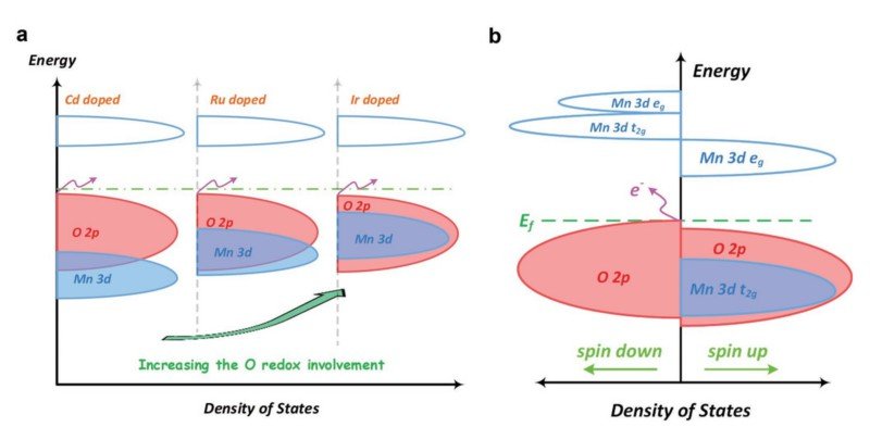 圖1 a) Cd Ru Ir摻雜后Mn基層狀富鈉材料的態(tài)密度結(jié)構(gòu)示意圖;b) Ir摻雜Na1.2Mn0.4Ir0.4O2能帶結(jié)構(gòu)示意圖