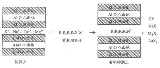 最常見的改性方法是在適當(dāng)條件下用有機陽離子將膨潤土層間無機陽離子交換出來。或者直接在膨潤土層間插入有機分子,改變層間域親水環(huán)境,使得其呈疏水性。同時又增加了粘土礦物中的有機質(zhì)含量。