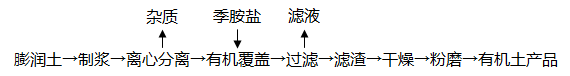 膨潤土粉→分散制漿→提純→改型(或改型→提純)→有機覆蓋→過濾→烘干→粉碎→產(chǎn)品