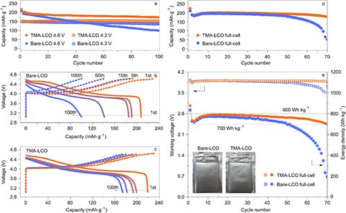 圖1. Ti、Mg、Al共摻雜LiCoO2(TMA-LCO)與未摻雜LiCoO2(Bare-LCO)的半電池和全電池性能對比