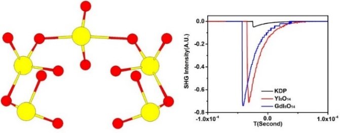 REI5O14 (RE= Y and Gd) 結晶于極性空間群Cm。其中I5O14由三個IO4和兩個IO3通過共頂角連接形成半圓形構型,具有較高的極化率。I5O14基團在單胞排列整齊,因此YI5O14 和GdI5O14均展現出了優異的倍頻性能,分別為KDP的14倍和15倍。理論計算表明,I5O14多聚體對于YI5O14和GdI5O14倍頻性能的貢獻率分別為91.28%和92.62%。此外,這兩個晶體在可見到中紅外波段均具有很好的透過性能。同傳統的水熱合成相比,磷酸能夠有效地增強反應媒介的粘稠度,從而有利于碘酸根的聚合。該研究結果有望為碘酸鹽NLO晶體的設計與合成提供一條簡便有效的新策略。