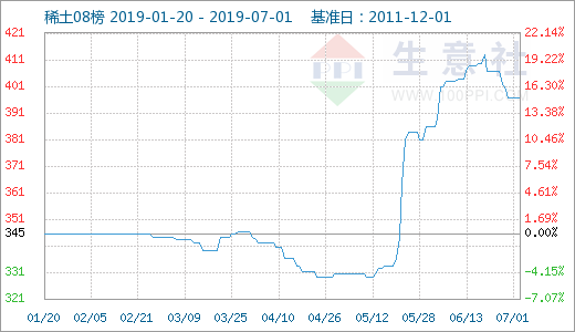 中國粉體網訊 6月30日稀土指數為397點,與昨日持平,較周期內最高點1000點(2011-12-06)下降了60.30%,較2015年09月13日最低點271點上漲了46.49%。(注:周期指2011-12-01至今)。