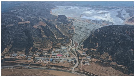 4月8日,俯瞰原則溝赤泥庫。赤泥庫壩下游正對溝口有10戶村民,兩側300米范圍內約有25戶。