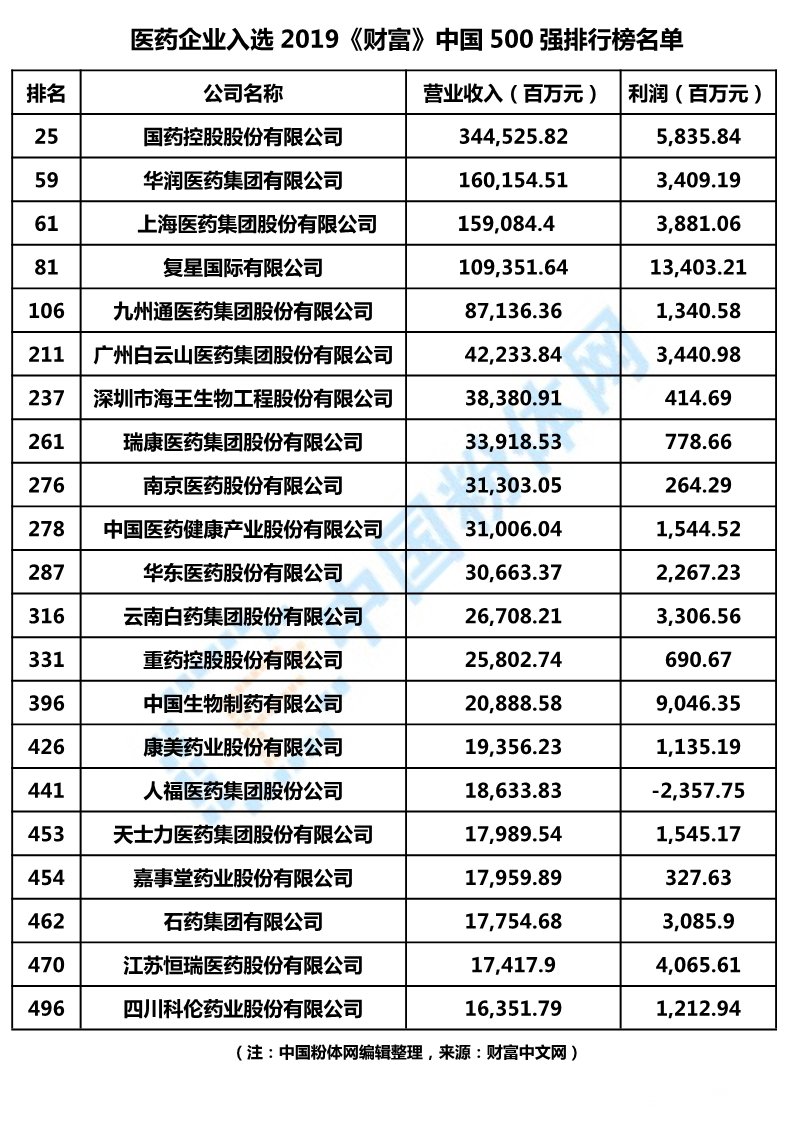 榜單頭部公司依然是:中石化、中石油和中國建筑。中國平安蟬聯非國有企業第一位。其中上榜的醫藥公司有哪些呢?中國粉體網小編做了如下整理: