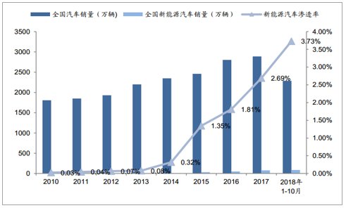 近年來,由于全球的能源緊缺和環境問題日益嚴重,各國都在加大新能源汽車的布局投入,新能源汽車取代燃油汽車幾乎已成為必然趨勢。2018年中國新能源汽車行業滲透率3.73%,潛在市場空間巨大。