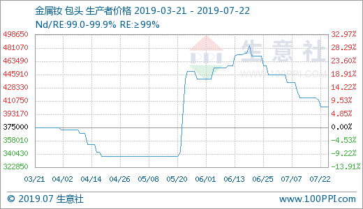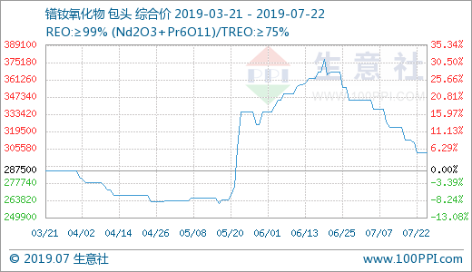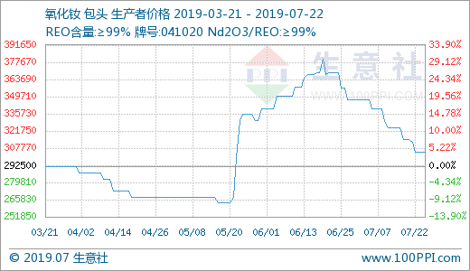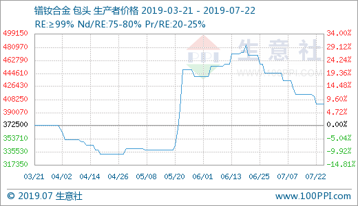 自6月下旬開(kāi)始,國(guó)內(nèi)輕稀土市場(chǎng)價(jià)格大幅走低,氧化釹價(jià)格從380000元/噸走低至304500元/噸,整體跌幅高達(dá)19.87%;鐠釹氧化物價(jià)格從377500元/噸大幅走低至302500元/噸,跌幅高達(dá)19.8%;金屬釹價(jià)格從484000元/噸大幅走低16.84%至402500元/噸;鐠釹合金價(jià)格從484000元/噸下滑至402500元/噸,跌幅高達(dá)16.84%。近期國(guó)內(nèi)重稀土價(jià)格較為堅(jiān)挺,但是輕稀土市場(chǎng)價(jià)格大幅走低,近期國(guó)內(nèi)磁材企業(yè)進(jìn)入需求淡季,短期之內(nèi)對(duì)于輕稀土需求不見(jiàn)好轉(zhuǎn),受部分廠家低價(jià)拋貨影響,輕稀土市場(chǎng)價(jià)格跌跌不休,但是中重稀土市場(chǎng)受供需方面影響,價(jià)格較為堅(jiān)挺。