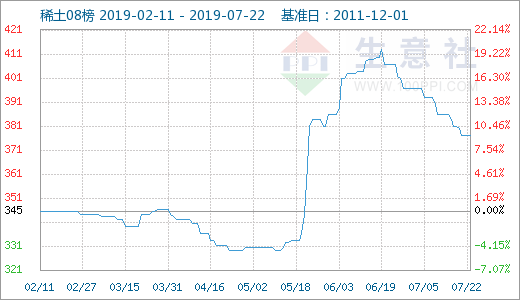 據(jù)監(jiān)測(cè)顯示7月22日稀土指數(shù)為377點(diǎn),與昨日持平,較周期內(nèi)最高點(diǎn)1000點(diǎn)(2011-12-06)下降了62.30%,較2015年09月13日最低點(diǎn)271點(diǎn)上漲了39.11%。(注:周期指2011-12-01至今)。