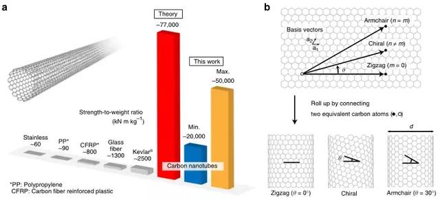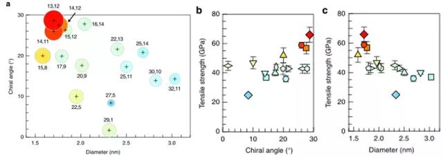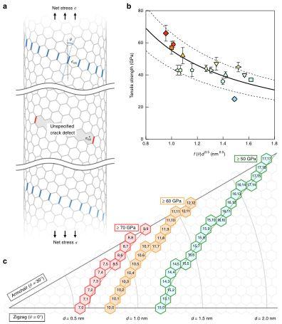 近日,來自日本名古屋大學、京都大學、愛知工業大學和兵庫縣立大學的科研團隊合作,首次報道了實驗測量的單個結構定義的單壁碳納米管的極限拉伸強度。其強度取決于納米管的手性結構,其中小直徑、近扶手椅狀納米管具有最高的拉伸強度。這種觀察到的結構依賴關系可以通過內部結構依賴的原子間應力得到全面的理解,它集中在真實納米管中不可避免存在的結構缺陷上。這些發現突出了在試圖制造最強材料時應該合成的目標納米管結構。該研究成果以題為“Strength of carbon nanotubes depends on their chemical structures”的論文發表在《Nature》子刊《Nature Communications》上(見文后原文鏈接)。
