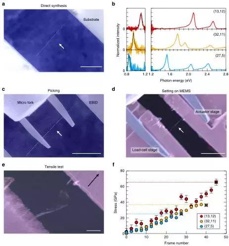 高強度和輕量化材料一直是廣泛研究領域中備受追捧的結構材料。單壁碳納米管理論上具有100-200 GPa范圍內的極限固有拉伸強度,是現有材料中最高的。然而,先前的實驗研究表明,實際碳納米管的強度重量比通常比無缺陷單壁碳納米管的理想值低幾倍,這是由于實際碳納米管中不可避免地存在結構缺陷,并且表現出相當程度的分散性。由于缺乏系統的實驗研究,使得真正的單壁碳納米管的斷裂機理一直模糊不清,因此阻礙了制造具有理想強度重量比的宏觀結構材料的發展。