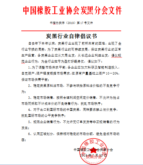 2019年8月1日,中國橡膠工業協會炭黑分會發布《炭黑行業自律倡議書》,《倡議書》稱,自去年下半年以來,炭黑行業出現了前所未有的困難,出現了全行業虧損的局面,為保證炭黑行業的正常生產經營,倡議各企業自覺限產,限產幅度應根據市場需求在原有產量基礎上限產10%-20%,保證市場供需平衡;穩定炭黑原料油市場,不參與哄抬原料油價格的不良競爭行為;穩定市場銷售,按照合理利潤空間銷售,不允許為搶占市場采取不計成本價的不良銷售行為擾亂市場秩序;對于出口到國際市場的中國炭黑,同樣要求禁止低價競爭擾亂國際市場公平競爭秩序;規范銷售行為,不允許無訂單發貨等非正規銷售行為發生;認同區域劃分,保持相對穩定的市場份額,避免造成市場動蕩。