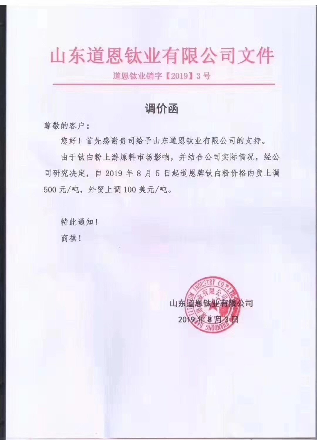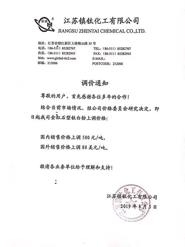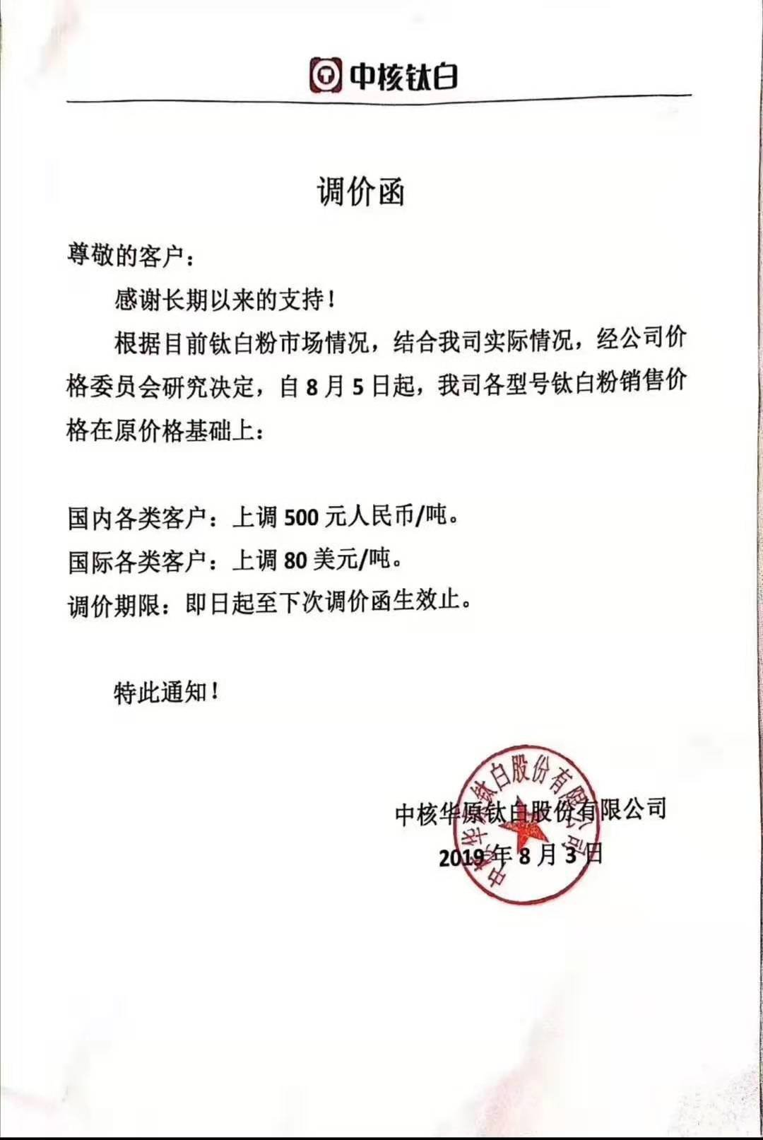 2019年8月3日,中核鈦白發(fā)布調(diào)價函稱,根據(jù)目前鈦白粉市場情況,結(jié)合我司實際情況,經(jīng)公司價格委員會研究決定,自8月5日起,我司各型號鈦白粉銷售價格在原價基礎(chǔ)上:國內(nèi)各類客戶上調(diào)500元人民幣/噸,國際各類客戶上調(diào)80美元/噸。