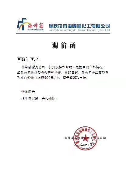 2019年8月2日,龍蟒佰利宣布,自8月15日起,公司各型號鈦白粉(包括硫酸法鈦白粉、氯化法鈦白粉)銷售價格在原價基礎(chǔ)上對國內(nèi)各類客戶上調(diào)500元人民幣/噸,對國際各類客戶上調(diào)50美元/噸。